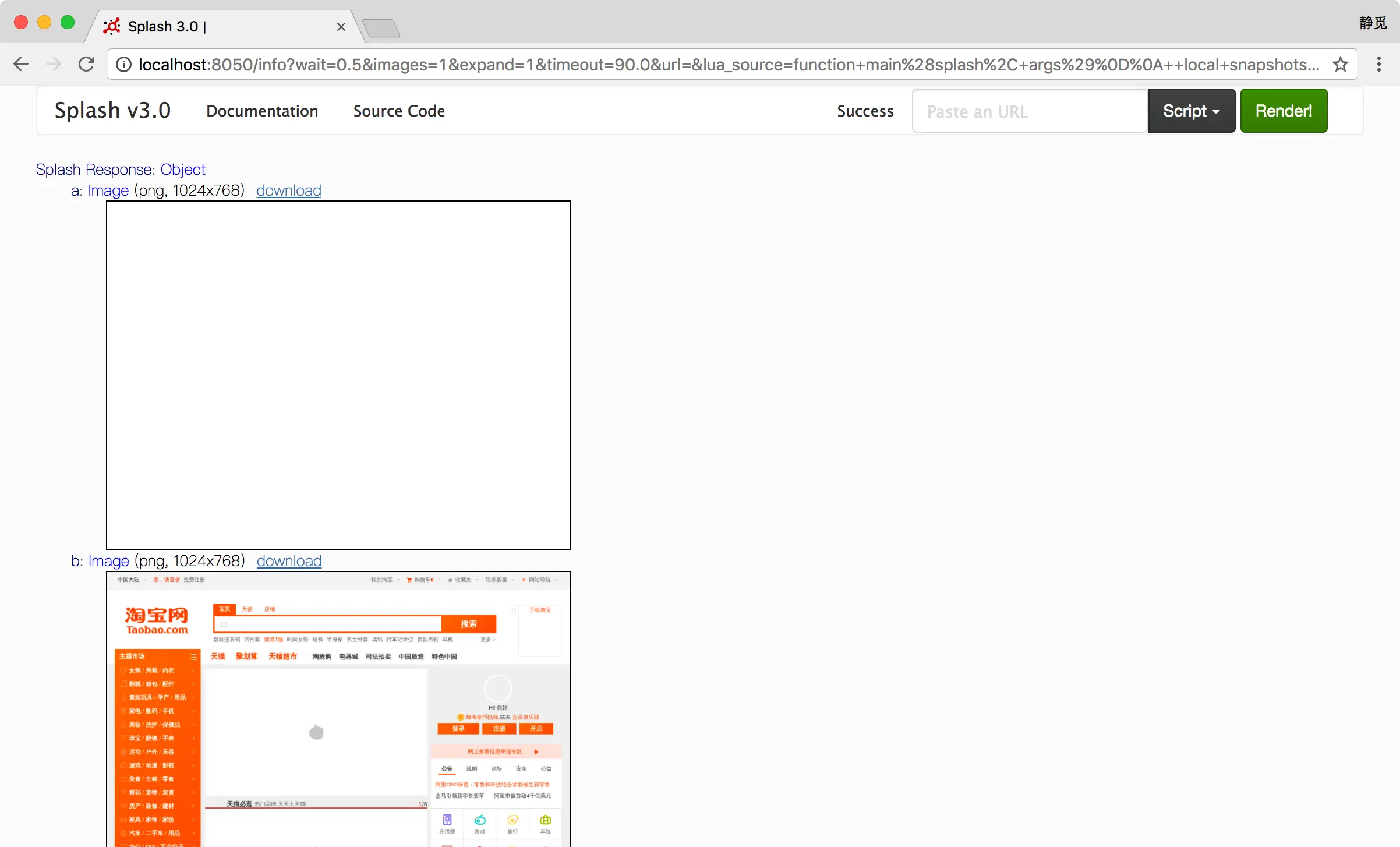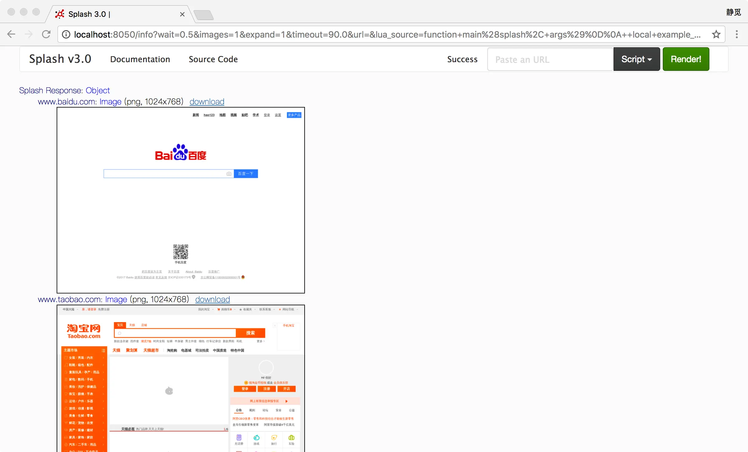 1 | curl http://localhost:8050/render.png?url=https://www.taobao.com&wait=5&width=1000&height=700 |