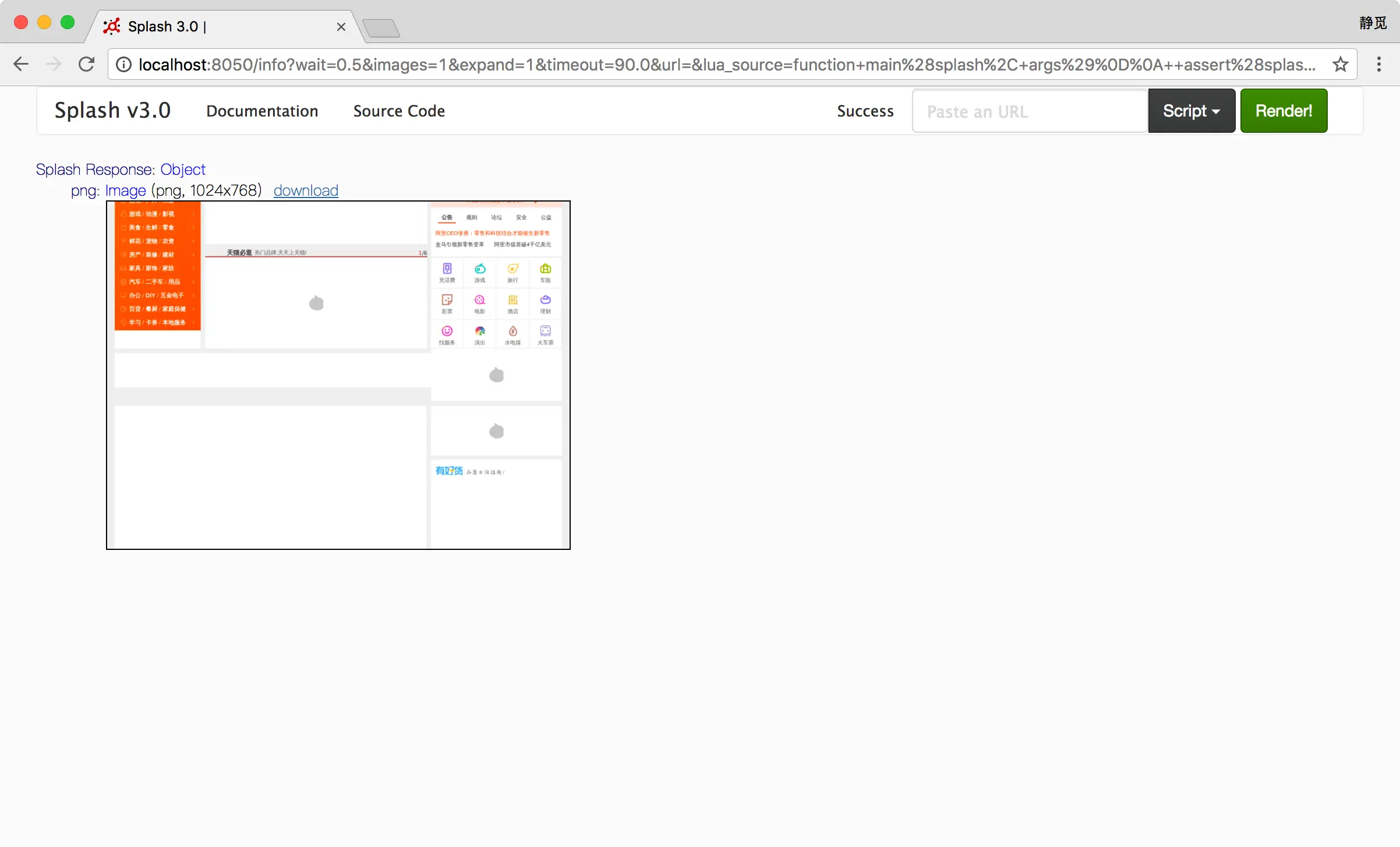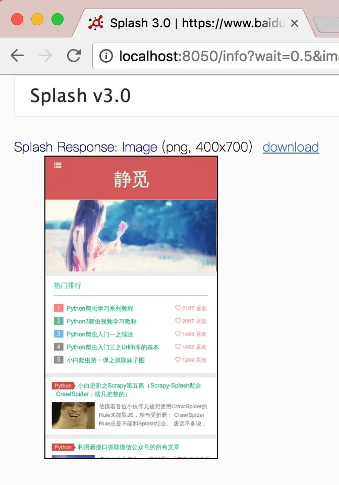 此接口可以获取网页截图,其参数比render.html多了几个,比如通过width和height来控制宽高,它返回的是PNG格式的图片二进制数据。示例如下:
