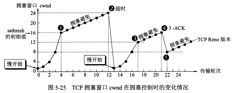 如上图所示,初始状态拥塞窗口从1个报文段开始,然后以“慢开始”算法进行增长,当拥塞窗口>慢开始门限时转为使用拥塞避免算法;当拥塞窗口=24时,即“2”点,发生了超时,则重置拥塞窗口为1个报文段,并且将慢开始门限置为超时前的一半=24/2=12;在“4”点发生了3次冗余ACK,是利用了“快速重传”算法立即通知发送方某个报文段丢失,由于是部分报文段的丢失,所以不启用“慢开始”算法,而是启用“快恢复”算法:调整慢开始门限=拥塞窗口/2,并将拥塞窗口置为当前的一半,然后直接以“拥塞避免”算法开始。