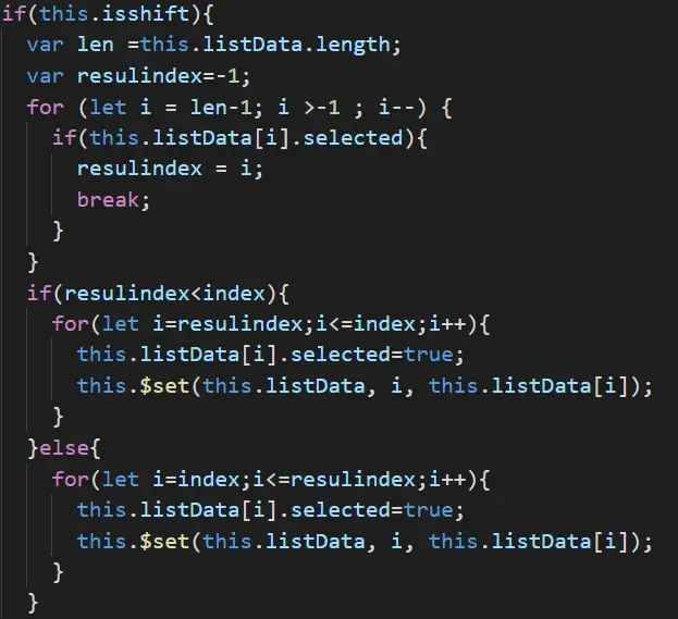 if(this.isshift){ var len =this.listData.length; var resulindex=-1; for (let i = len-1; i >-1 ; i--) { if(this.listData[i].selected){ resulindex = i; break; } } if(resulindex<index){ for(let i=resulindex;i<=index;i++){ this.listData[i].selected=true; this.$set(this.listData, i, this.listData[i]); } } else{ for(let i=index;i<=resulindex;i++){ this.listData[i].selected=true; this.$set(this.listData, i, this.listData[i]); } } }
