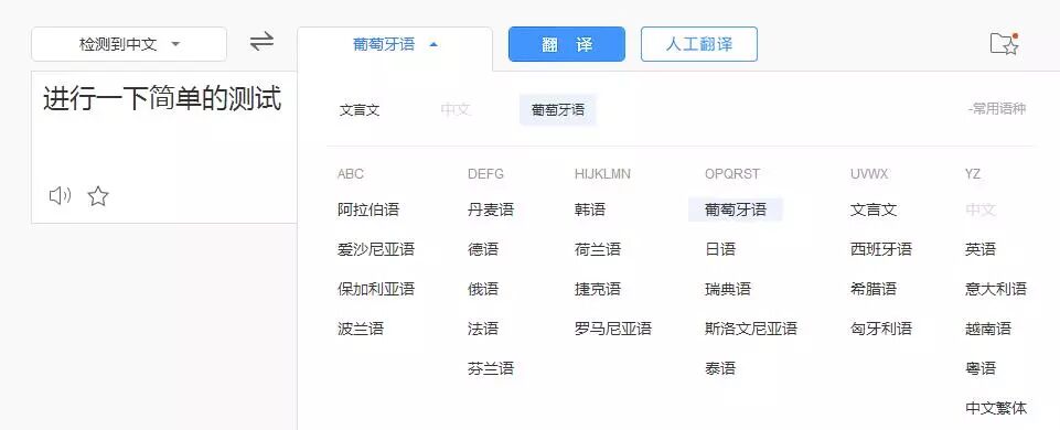 打开百度翻译之后,左侧输入要说的话,然后选择语种,最好选择生僻的小语种,比如葡萄牙语等等,点击翻译,右侧选中翻译后的内容。
