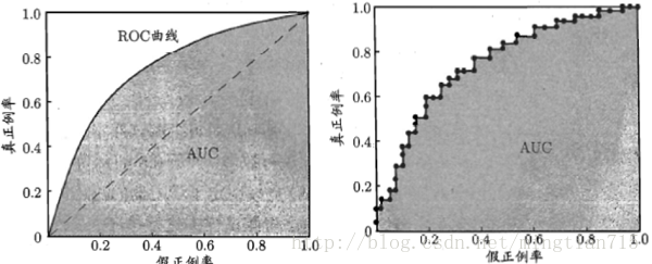 下图为ROC曲线示意图,因现实任务中通常利用有限个测试样例来绘制ROC图,因此应为无法产生光滑曲线,如右图所示。