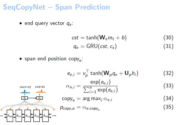 有了qs之后,我们直接把它作为一个pointer network的输入。在整个句子中做了一个Attention,可以看到COPYs是取概率最大的位置。从这个图例中我们看到系统用q s在输入当中进行了一个Attention,最大的位置我们假设是12,它就选择出来COPY的起始位置是12。