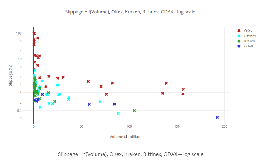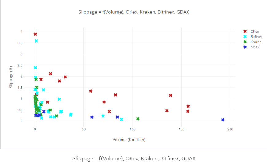 上图可以看出: Bitfinex,Kraken, GDax的 Slippage的大致相似。而OKex的Slippage要远远高于他们。