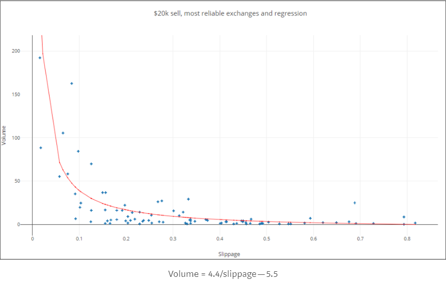 收集各平台的订单簿(OrderBook),测量对每一种数字货币,售卖价值50000美元(有钱人哪!!!)的数字货币对价格的影响。这个价格的变化被称为Slippage(滑点),然后对应的交易所的市场交易量,适当增加或者减少售卖的额度,再看Slippage