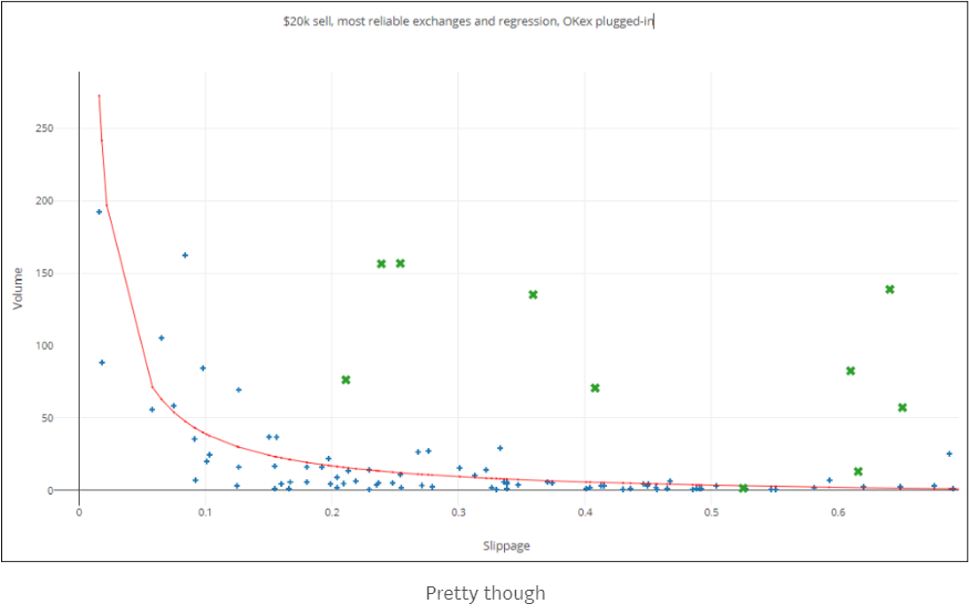 Slippage和交易量应该大体上是一个反比关系。当然每个货币的反比系数会有差别。其中的逻辑是:有巨额交易量的交易对->卖家和买家一定有激烈的竞价 -> Orderbook就会很厚 -> 价格的散布(Spread)就会减少 == Slippage就会比较小