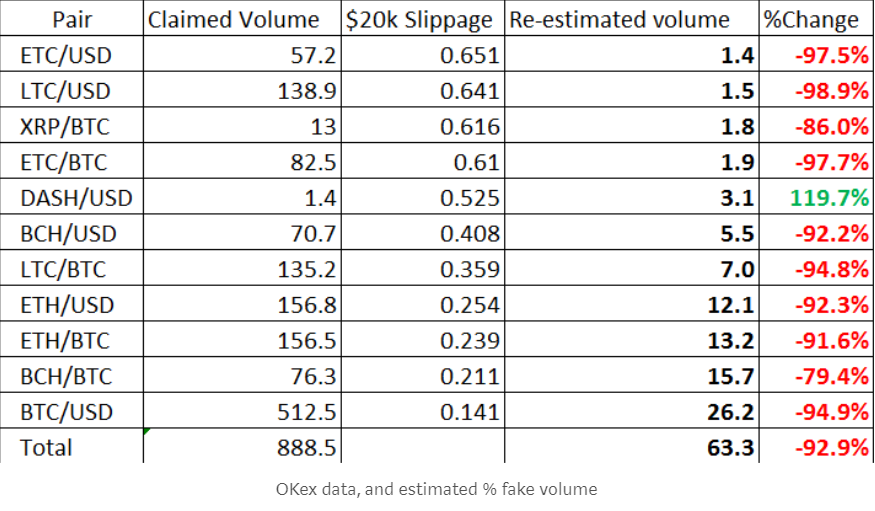 OKCoin about 92.9% off all OKex’s volume is most likely fabricated.