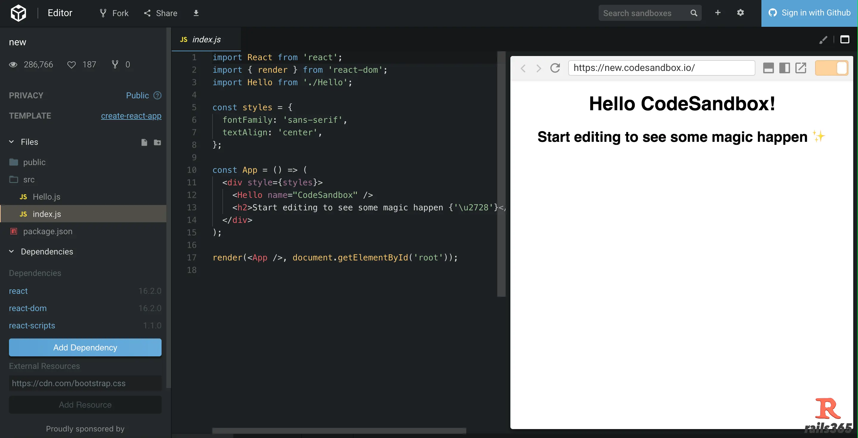 一个在线编写前端代码的好玩的工具 小小随风 2018-03-28 468 阅读1分钟 https://codesandbox.io/ 可以编写 Angular,React,Vue 等前端代码。 可以实时编辑和 preview。 live 功能,可以多人协作编辑,不过是收费的功能。 可以增加依赖的包,比如编写 React 时,可以安装任意的第三方的包。 https://www.rails365.net/movies