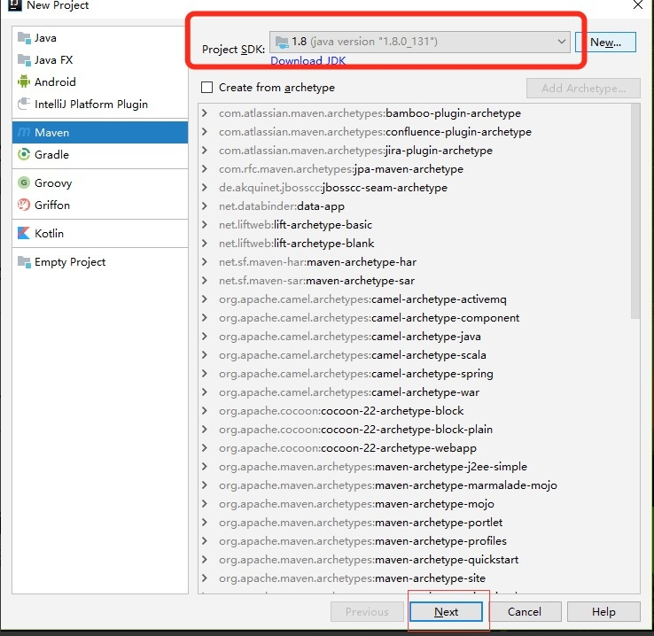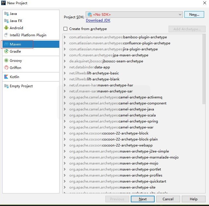 选择窗口左侧的Maven选项,表明接着要创建Maven类型的项目,IDE会自动创建这种类型项目所需的一切,如pom.xml文件等,如下所示:
