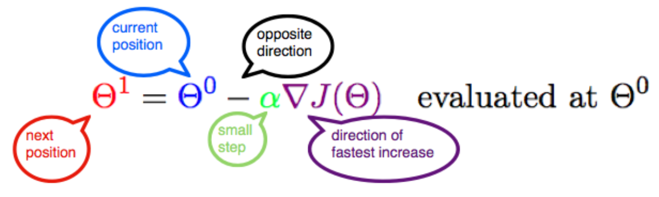 image.png 此公式的意义是:J是关于Θ的一个函数,我们当前所处的位置为Θ0点,要从这个点走到J的最小值点,也就是山底。首先我们先确定前进的方向,也就是梯度的反向,然后走一段距离的步长,也就是α,走完这个段步长,就到达了Θ1这个点!