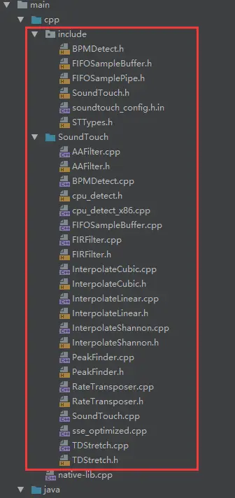 1.4、在项目cpp文件夹中创建include和SoundTouch文件夹,并把下载好的SoundTouch里面的include和SoundTouch的源码拷贝进去就可以了,目录结构如下: