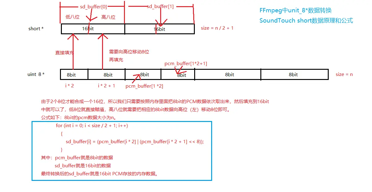 这里要处理的就是把uint_8 *(8bit)的数据转换成short(16bit)的数据格式。这里其实就是做bit的位运算,原理如下如: