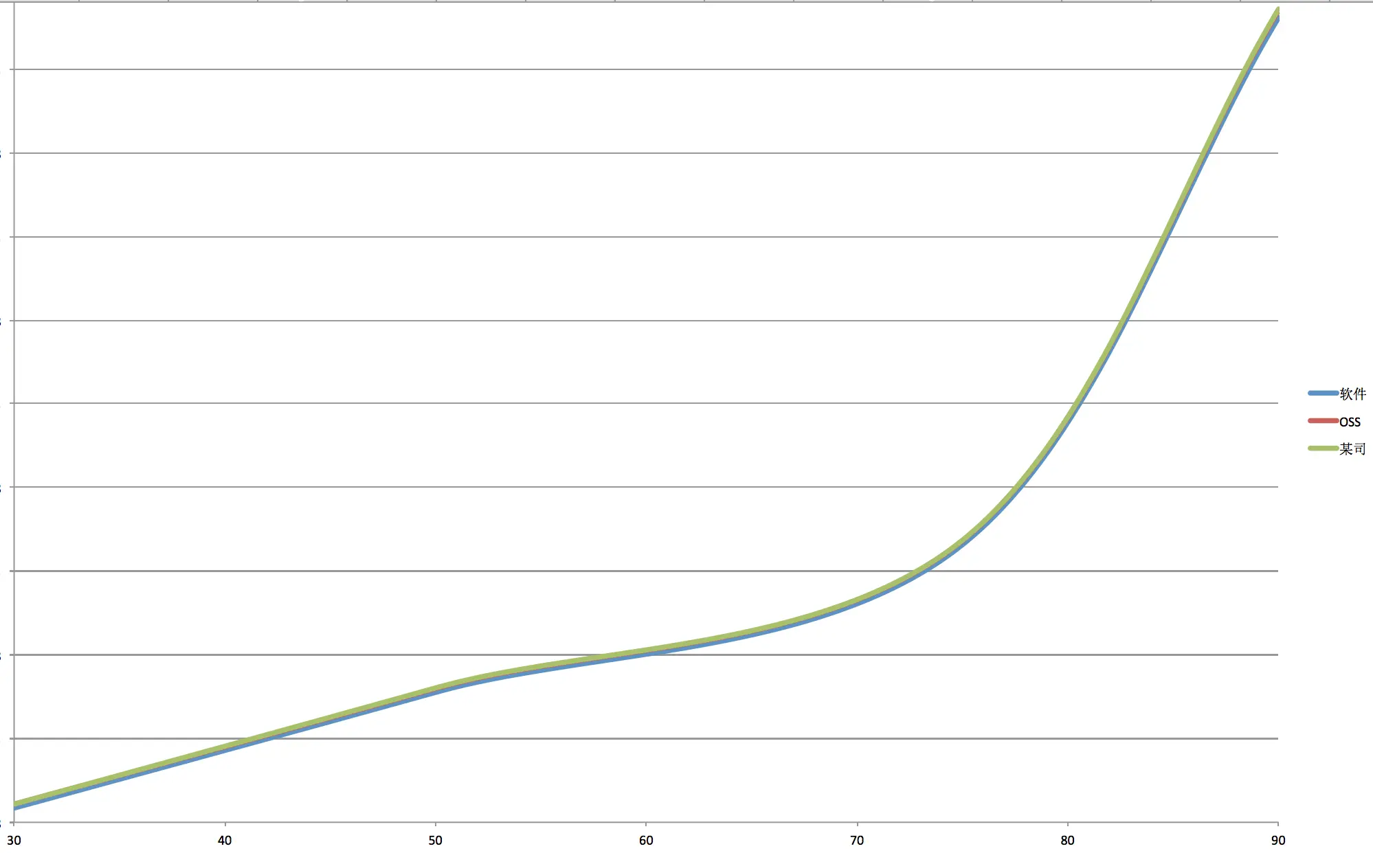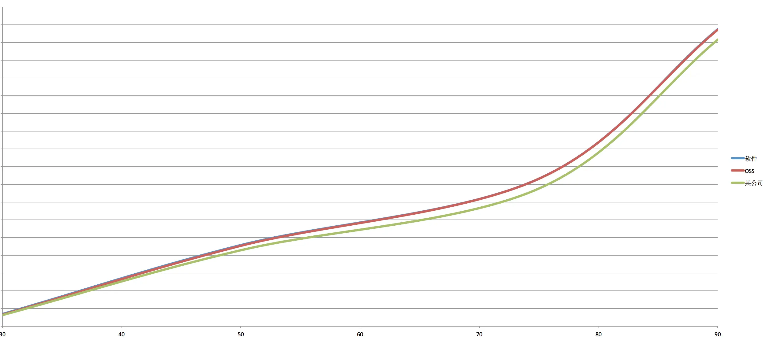 同样使用图片空间的测试架,quality设置也一样,数值为相对JPEG原图的压缩率,数值越小越好。经过测试我们发现软件、OSS、某司的压缩率几乎完全重合,但依旧保持原有梯队,软件>OSS>某司。