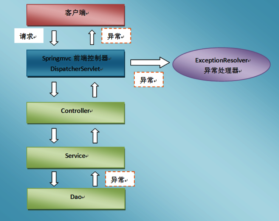 Spring MVC中, 系统的DAO, Service, Controller层出现异常, 均通过throw Exception向上抛出, 最后由中央处理器DispatchServlet交由全局异常处理器进行异常处理, 如下图所示