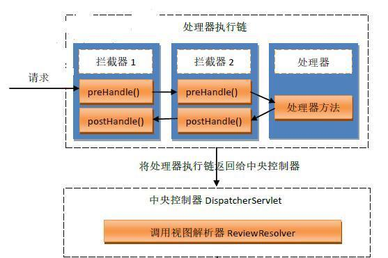 当有多个拦截器时, 形成拦截器链, 拦截器链执行顺序与注册顺序一致, 需要注意的是,当一个拦截器preHandle()返回false时, 上部的拦截器链将被断开, 后续的处理器以及对于的postHandle()都无法执行, 只有已经执行通过的拦截器的afterCompletion()方法会执行.