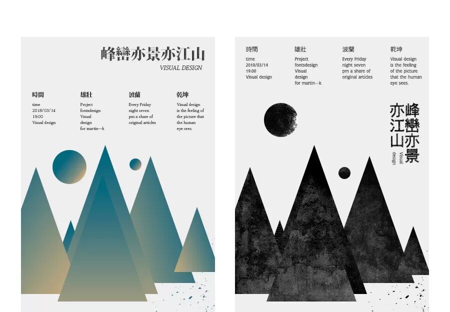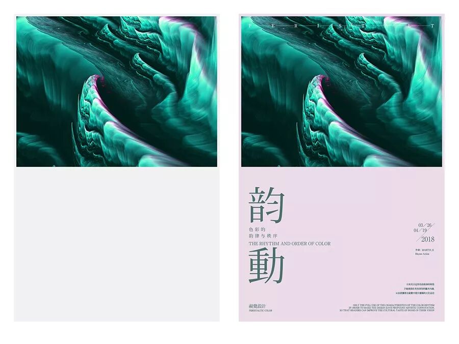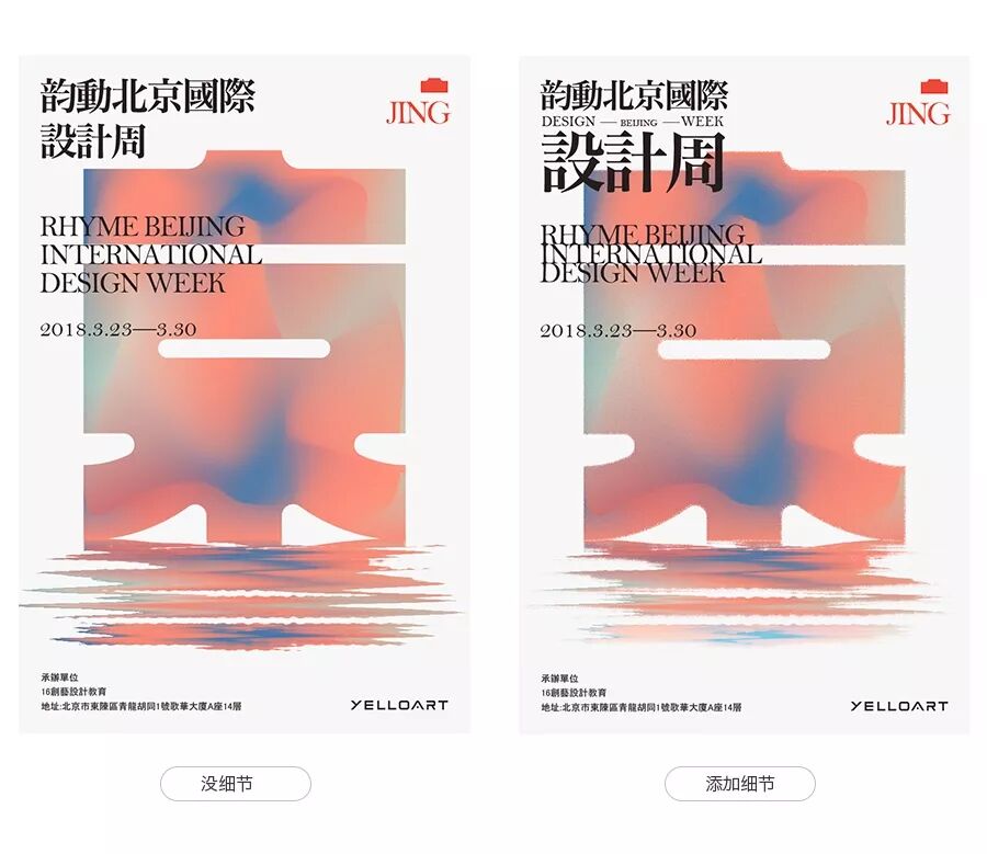 通过两个相同内容的案例演示可以看出,左边的案例的形式,编排,色彩等信息并没有什么问题,但就整体而言画面的视觉效果并不是很有感觉,色彩太过于跳跃使得画面有种不伦不类的感觉;而右边的案例则是添加肌理,对文字信息的编排以及部分元素进行适当的调整之后可以看出,左边的案例虽然也具有一定的合理有序性,但就最终呈现的视觉效果而言右边的明显要比左边的好一些;而视觉设计就是对这看似不起眼的细节进行舒适美观的整合;