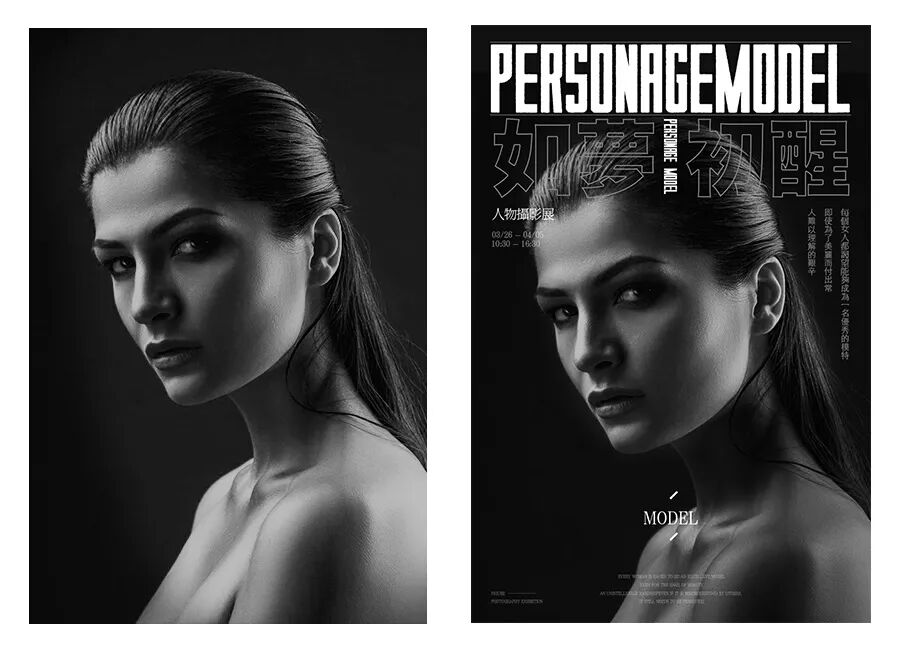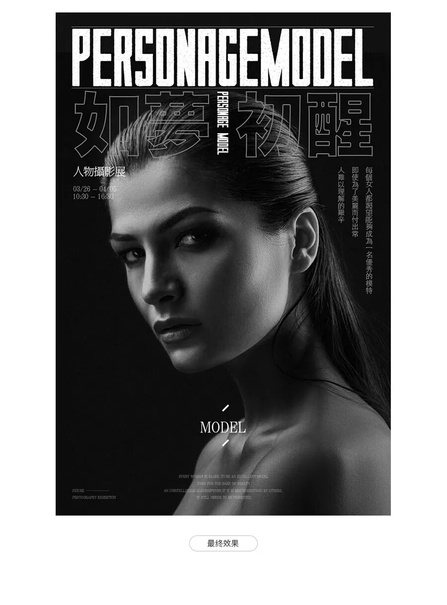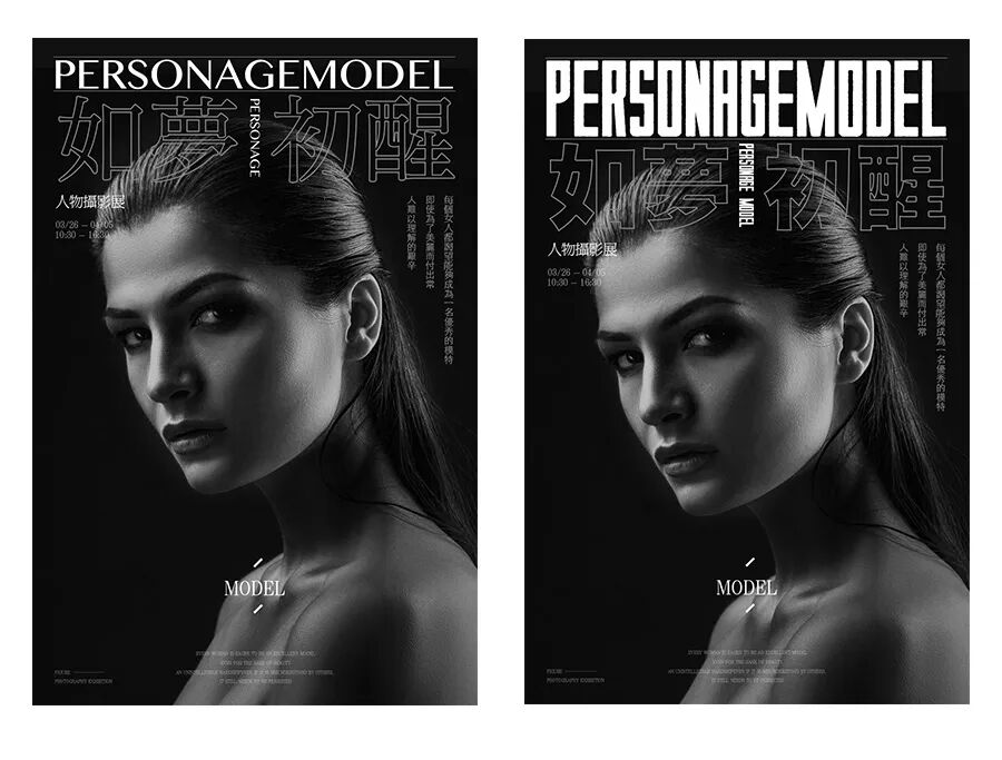 首先对人物素材进行适当的刻画处理,这里调整了一下人物的明暗对比度使其看起来更加的具有质感,同时凸显人物高光的部分,这一步也是大多数设计师容易忽略的问题,处理好之后接着就是字体等相关问题的处理;