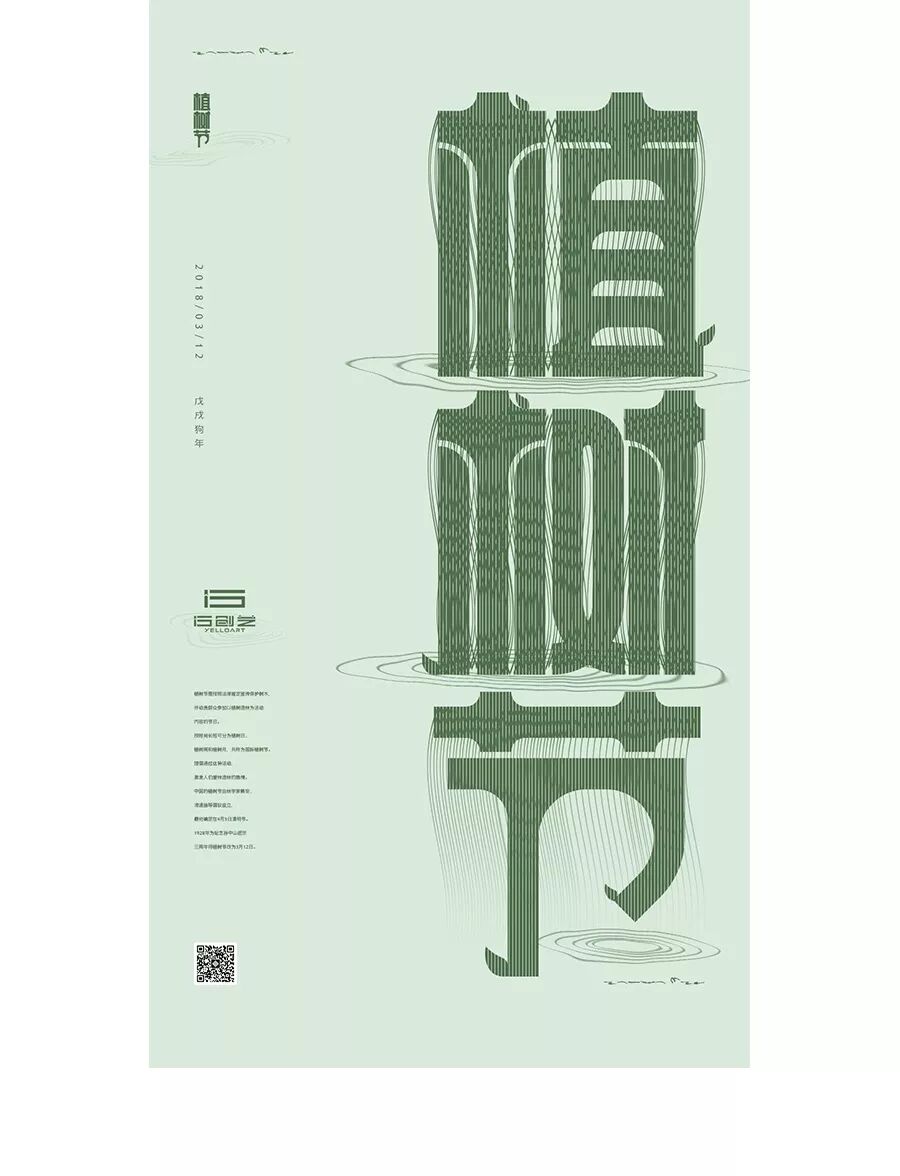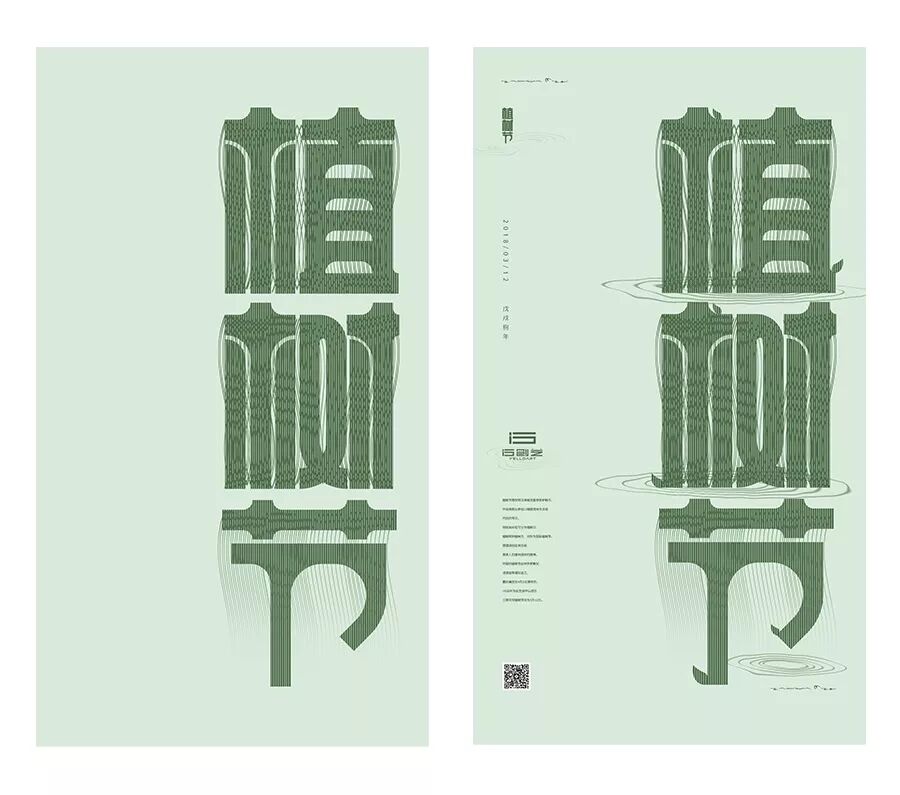 在进行形式化处理之后,把其他的文字也置入到画面当中,同时并对形式所传递的情景化的视觉感知,适当的添加一些水纹和叶子之类的修饰元素用以增强情景化的视觉表达,以形式为主的视觉延伸设计,整体效果可以很好的传递信息;