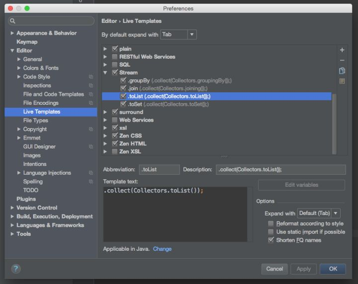如何用实时模板来解决上述问题?实际上我们只需要为所有普遍使用的默认数据流收集器创建我们自己的实时模板。例如,我们可以创建.toList缩写的实时模板,来自动插入适当的收集器.collect(Collectors.toList())。