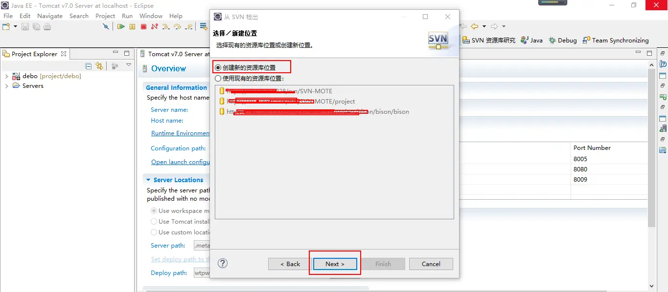 3.选择创建新的资源库位置,点击Next,如果项目之前已经导入过删除掉了,重新导入的时候,只需勾选使用已有的资源的位置(有历史记录,直接选中即可)