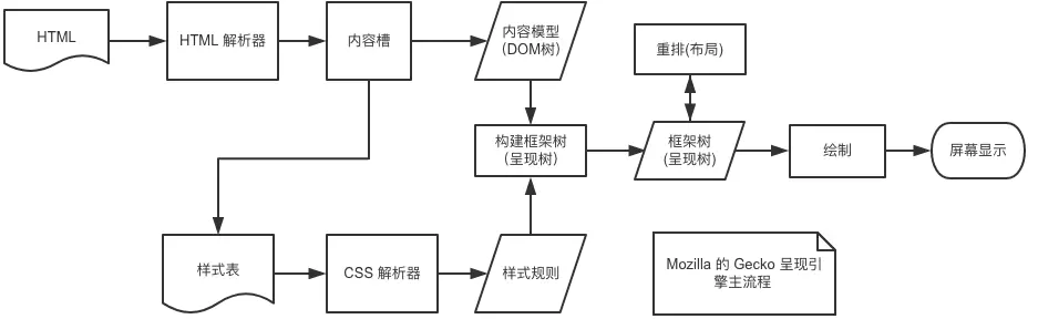 可以看到 Gecko 解析的流程多于WebKit,并在官方的术语上有着些许不同,另外呈现树与DOM树不一定相同,后面会做说明。