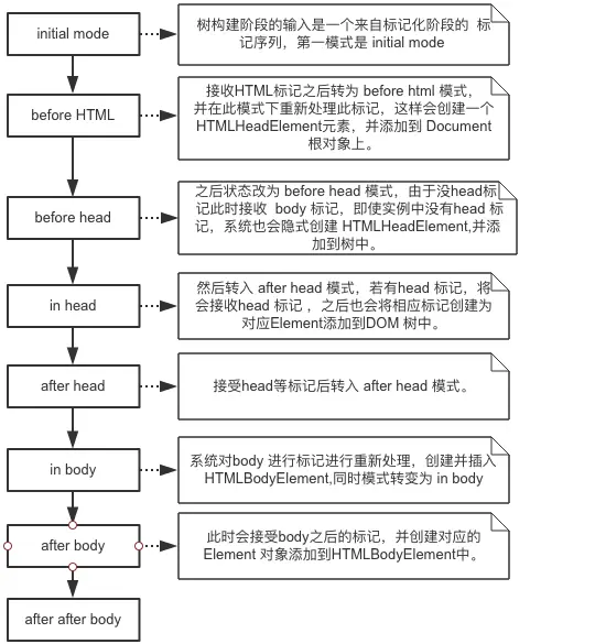 利用标记生成器( 标记化算法 )发送的每个节点的DOM 树,会不断进行处理。规范( W3C标准 )中定义了每个标记所对应的DOM元素,这些元素会在接受到相应的标记时创建。
