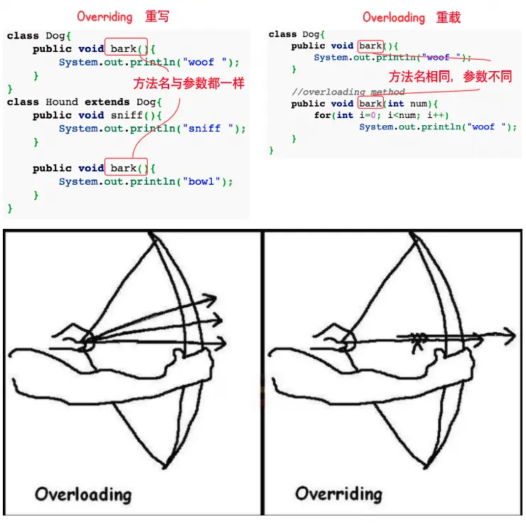 - 方法重载是一个类的多态性表现,而方法重写是子类与父类的一种多态性表现
