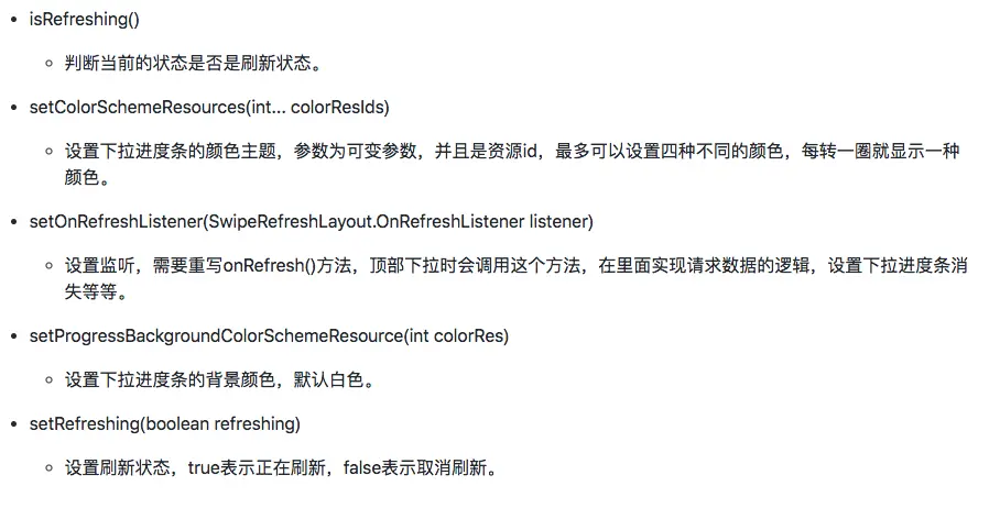 - 在这个布局里面只能包含一个子控件,而且是可以滑动的(因为要达到刷新的目的),如:RecycleView、ListView