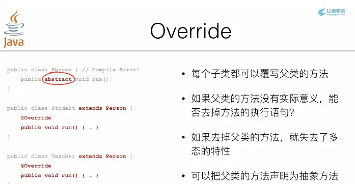 - 抽象类中的方法都是abstract的,但abstract类中的方法可以多种多样