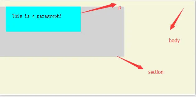在这里,这个P标签position为默认的static且它的父标签Section的display为inline,所以P标签的包含块为body标签,通过我们的判断规则一来确定。