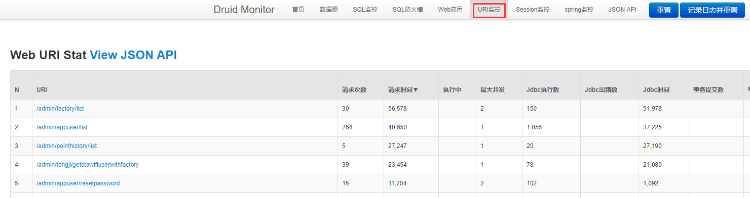 1.项目成功启动后,输入http://ip:端口+/druid/即可进入Druid Web URI Sta页面