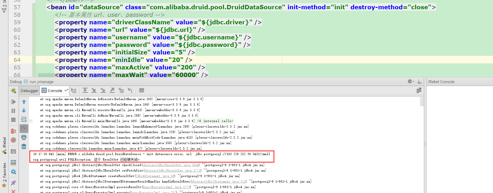 问题a:若数据库为镜像数据库(比如docker部署的postgres镜像数据库),则切换为druid后会报错无法启动项目: