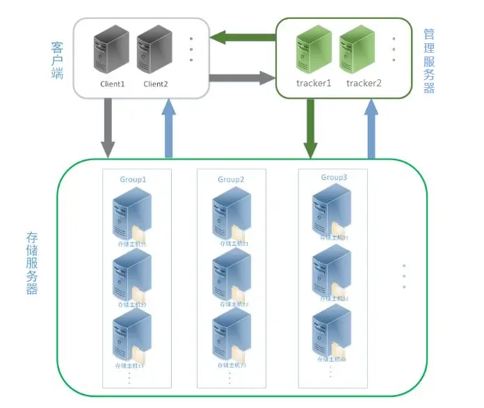 存储服务器(storage server):至少需要4台服务器,两两一组分布式架构,组内两个节点互为备份,组与组之间相互独立,存放不同的文件数据。