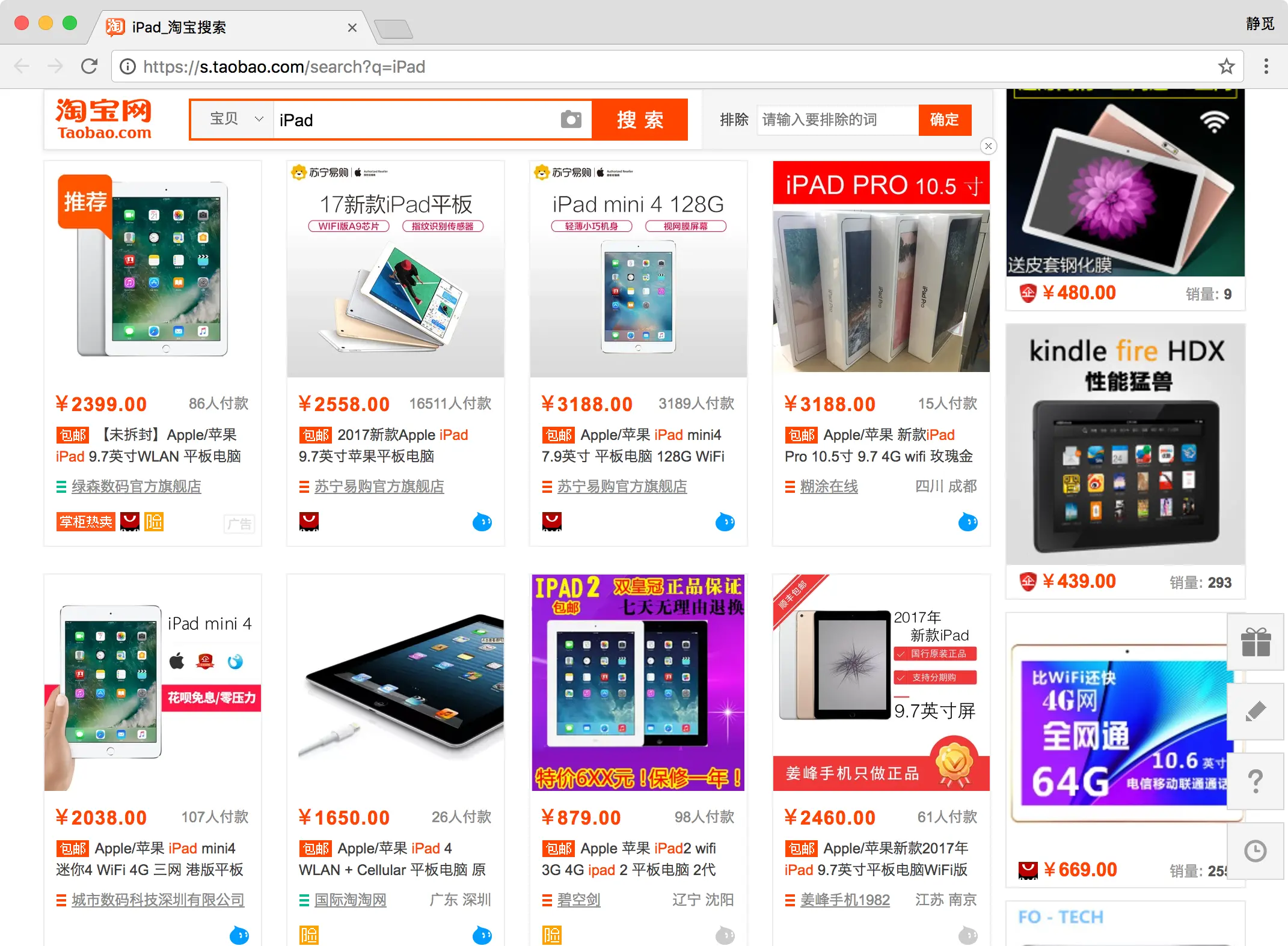抓取入口就是淘宝的搜索页面,这个链接可以通过直接构造参数访问。例如,如果搜索iPad,就可以直接访问s.taobao.com/search?q=iP…,呈现的就是第一页的搜索结果,如图7-22所示。