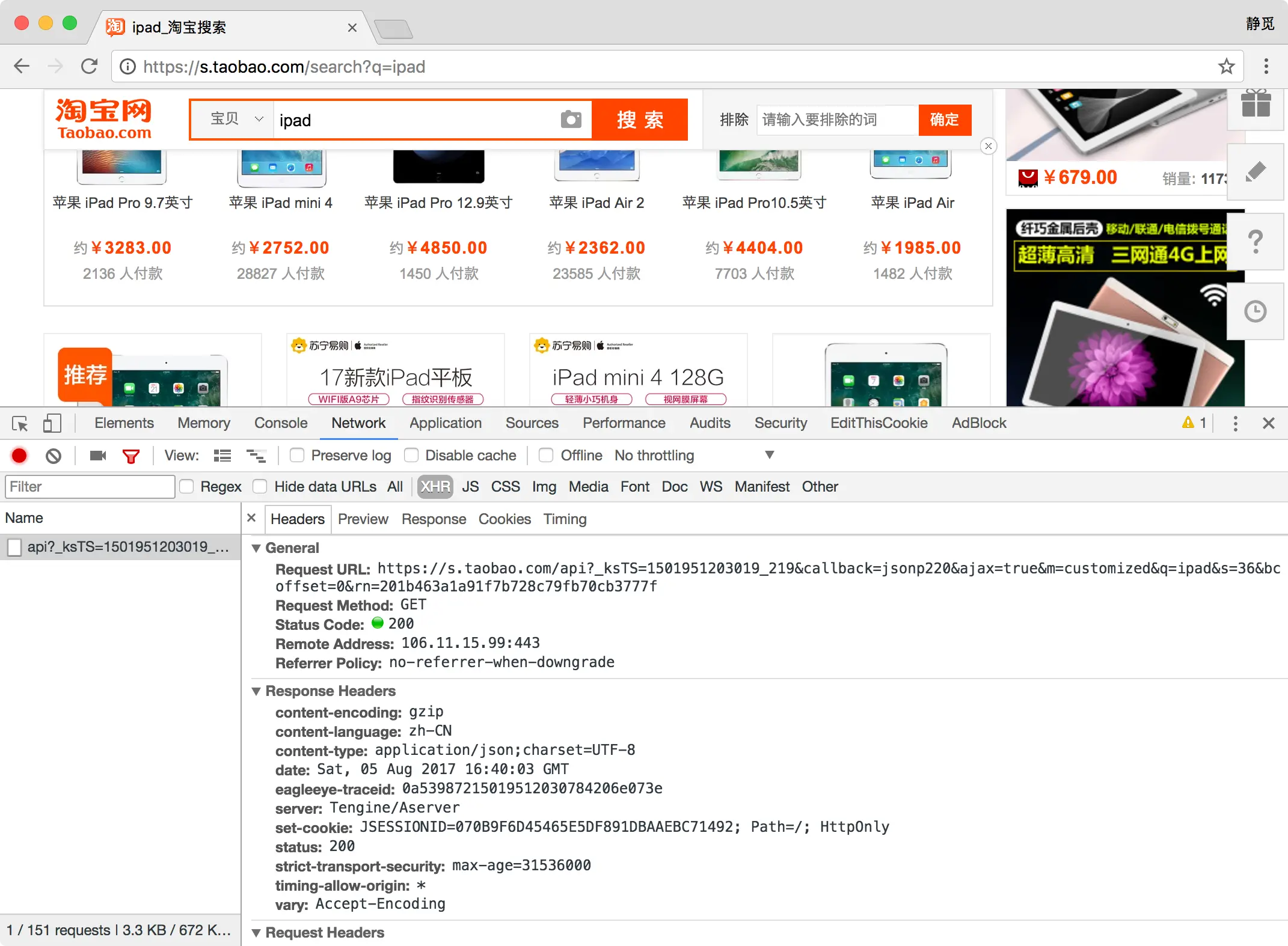 打开淘宝页面,搜索商品,比如iPad,此时打开开发者工具,截获Ajax请求,我们可以发现获取商品列表的接口,如图7-19所示。