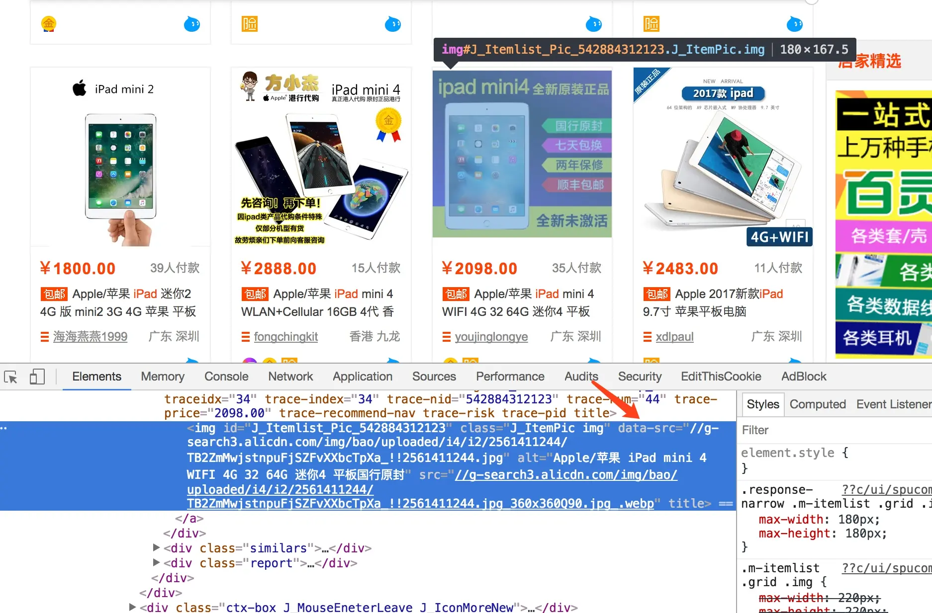 可以发现,它是一个img节点,包含id、class、data-src、alt和src等属性。这里之所以可以看到这张图片,是因为它的src属性被赋值为图片的URL。把它的src属性提取出来,就可以获取商品的图片了。不过我们还注意data-src属性,它的内容也是图片的URL,观察后发现此URL是图片的完整大图,而src是压缩后的小图,所以这里抓取data-src属性来作为商品的图片。