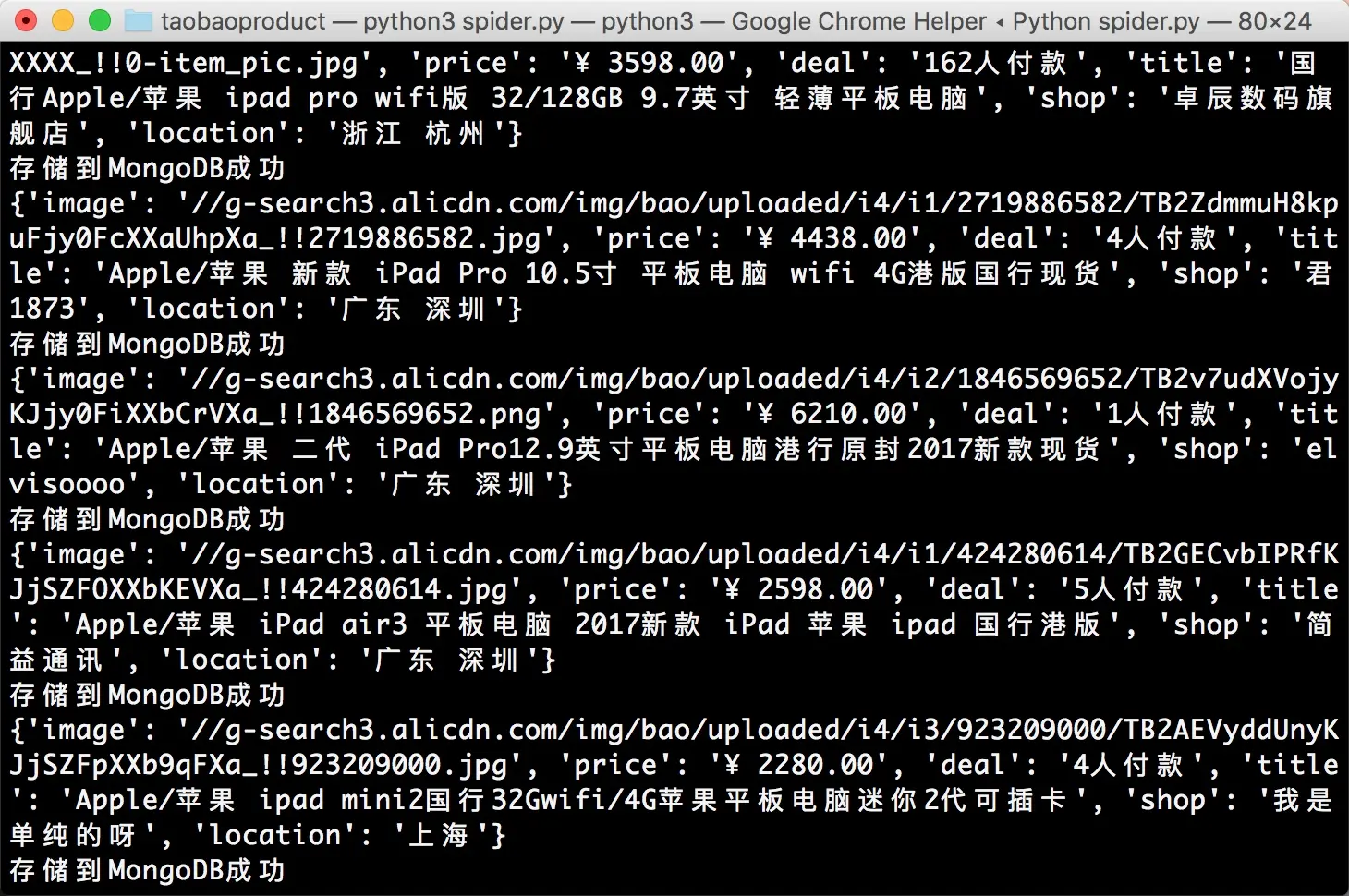 可以发现,这些商品信息的结果都是字典形式,它们被存储到MongoDB里面。