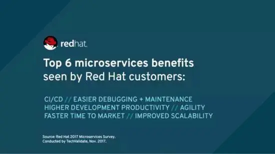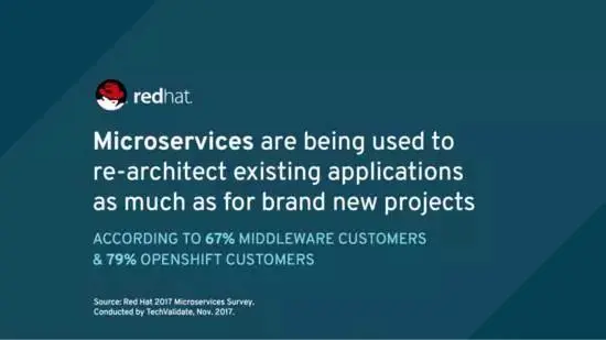 67%的红帽中间件客户和79%的红帽OpenShift客户反应了这一点,这些数据告诉我们,微服务在他们的IT转型过程中为用户提供了相应的价值——不管他们只是想更新当前的应用程序组合,还是正在准备新的计划。因此,如果只关注微服务的Greenfield项目,那么需要开始评估现有的应用程序进行微服务重新架构可能是一个好注意。微服务引入了一系列已经被证明的利益,不仅适用于新项目,也适用于现有的项目。