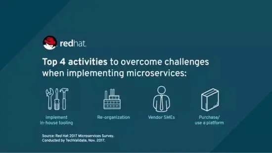 受访者表示,在微服务方面,他们一直依赖供应商和供应商中小企业作为他们信任的顾问,此外,许多人回应说,重组是一种缓和活动,以克服与企业文化有关的微服务挑战,因此,要在市场上评估微服务解决方案,并选择符合要求的最佳方案,如果解决方案存在漏洞,就在内部实现这些差距,依靠供应商来适应和实施微服务,想要从企业既定流程中激发变更,可能需要重新组建团队,通常引入文化变革和重组,最好先按小的几人团队开始。