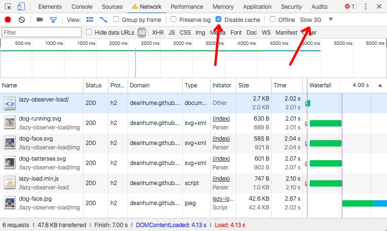 如果你正在以快速连接测试此演示,您甚至可能不会注意到图像被换出。我发现最好的测试方法是在Chrome开发人员工具中启用网络限制并禁用缓存