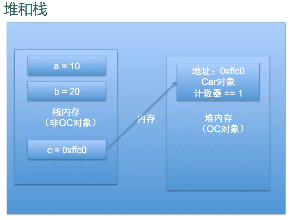 从上图可以看到,栈里面存放的是值类型,堆里面存放的是对象类型。对象的引用计数是在堆内存中操作的。下面我们讲讲堆和栈怎么存放和操作数据, 还有MRC和ARC怎么管理引用计数。