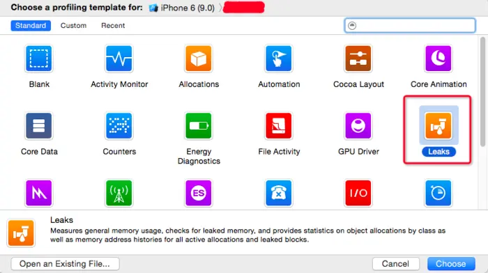 按上面操作,build成功后跳出Instruments工具,选择Leaks选项