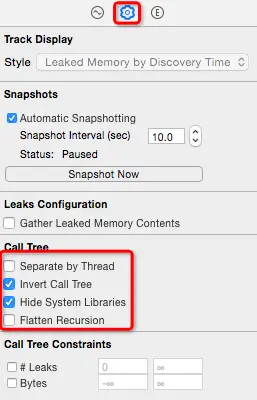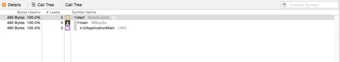 4.下面就是定位修改了,此时选中有红色柱子的Leaks,下面有个"田"字方格,点开,选中Call Tree
