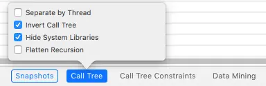 5.下面就是最关键的一步,在这个界面的右下角有若干选框,选中Invert Call Tree 和Hide System Libraries,(红圈范围内)显示如下: