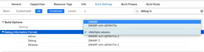 在选择call tree后,可能你会发现查看不到源码从而无法定位内存泄漏的位置,只是显示16进制的数据。此时需要你在Xcode中检查是否有dSYM File生成,如下图所示选择第二项DWARF with dSYM File.