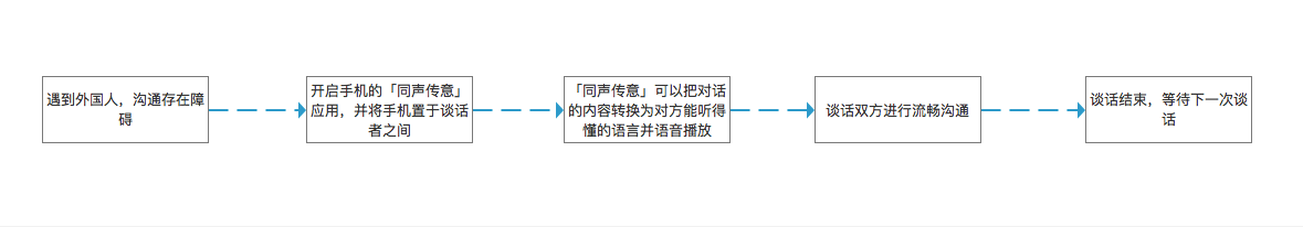 我们先把我们的产品暂时命名为「同声传意」,然后下面简单地展示了对应的设计流程图。 1、首先来看一下用户在旅行时使用「同声传意」的场景流程图。