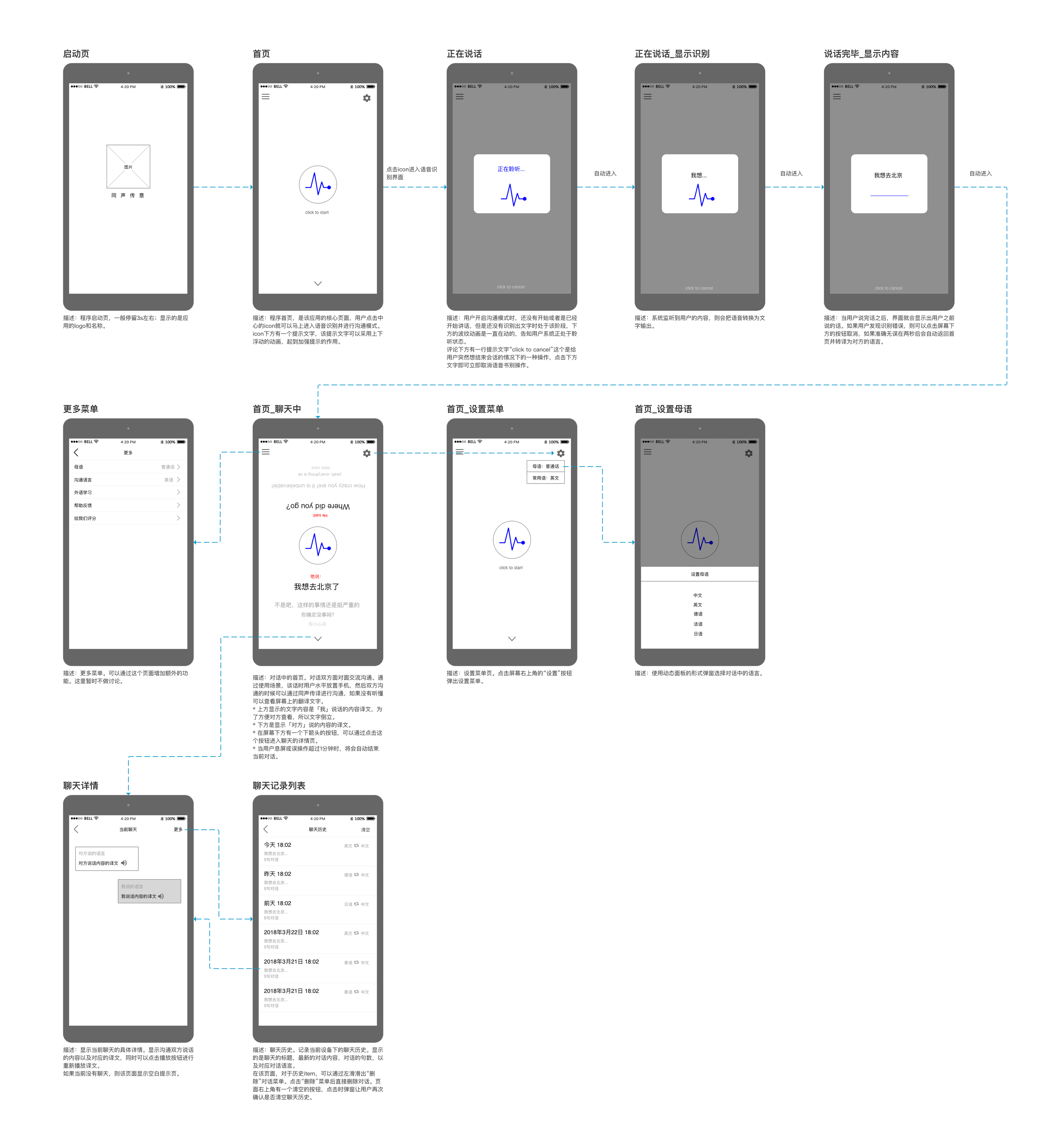以上的设计主要是从应用场景入手,目的是解决外出旅行的人们与当地人沟通的过程中存在语言沟通障碍的问题,大大增加人们在使用中的便利性。以上的因时间问题设计较为粗略,只是简单的对流程做了介绍。到真正可用阶段还需要对细节和流程进行更细更深的思考。