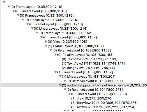 在Android的概念里,每个Window(ActivityWindow/DialogWindow/PopupWindow等)上面都生长着一棵ViewTree.而屏幕中看到的各种控件(ImageView/Button等)都是这棵ViewTree上的节点. 有Android开发环境的同学只需要打开AndroidDeviceMonitor-dump view hierarchy 就可以看到ViewTree的模样,如下图:
