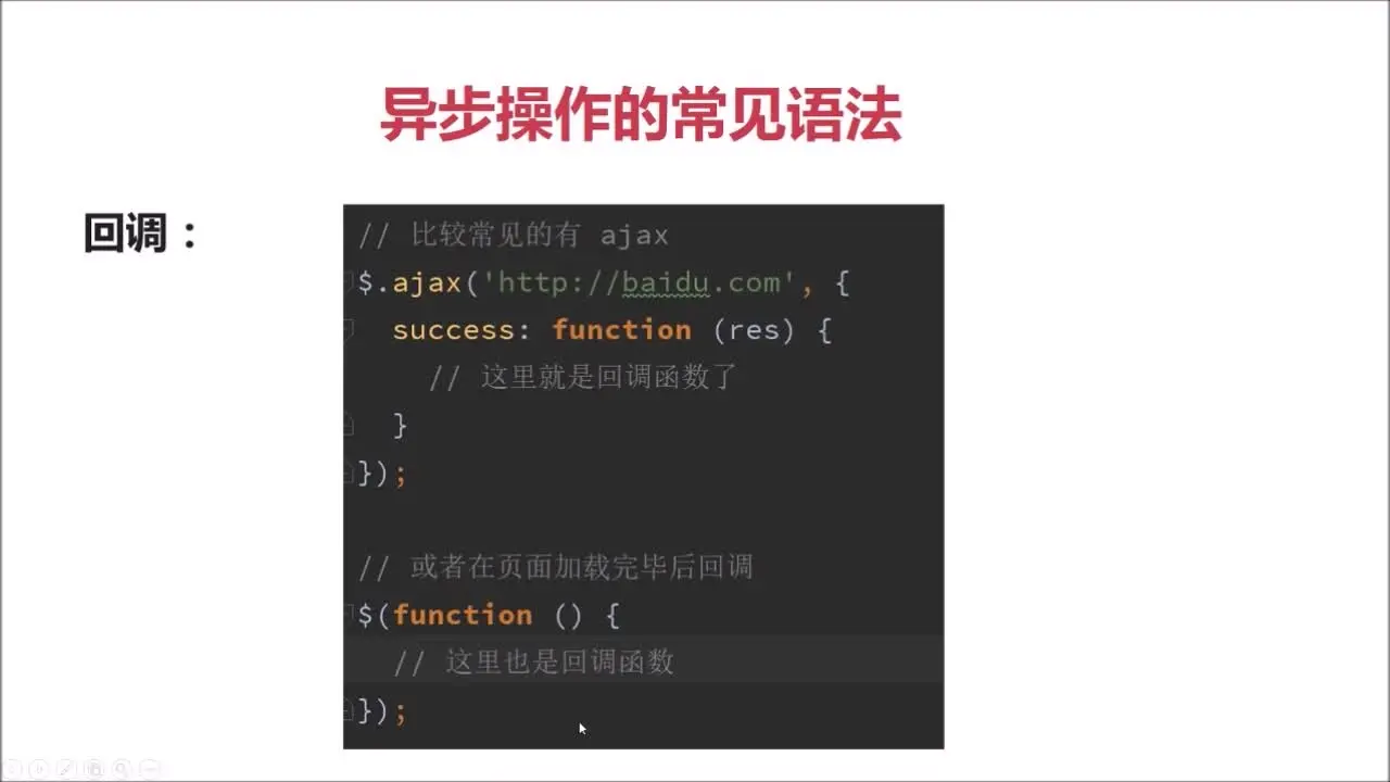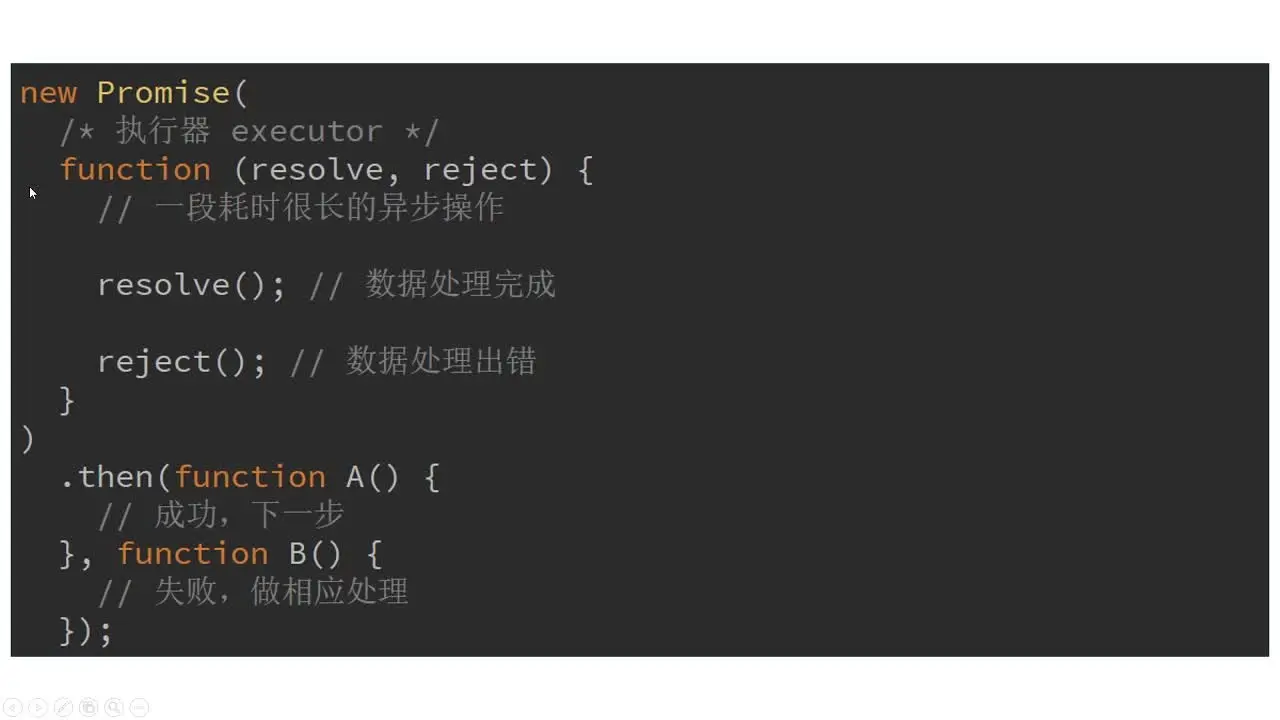 promise用途:异步操作队列化,比传统的异步操作回调函数和事件更合理更强大。(回调函数:回调函数就是一个参数,将这个函数作为参数传到另一个函数里面,当那个函数执行完之后,再执行传进去的这个函数。这个过程就叫做回调。主函数的事先干完,回头再调用传进来的那个函数 )
