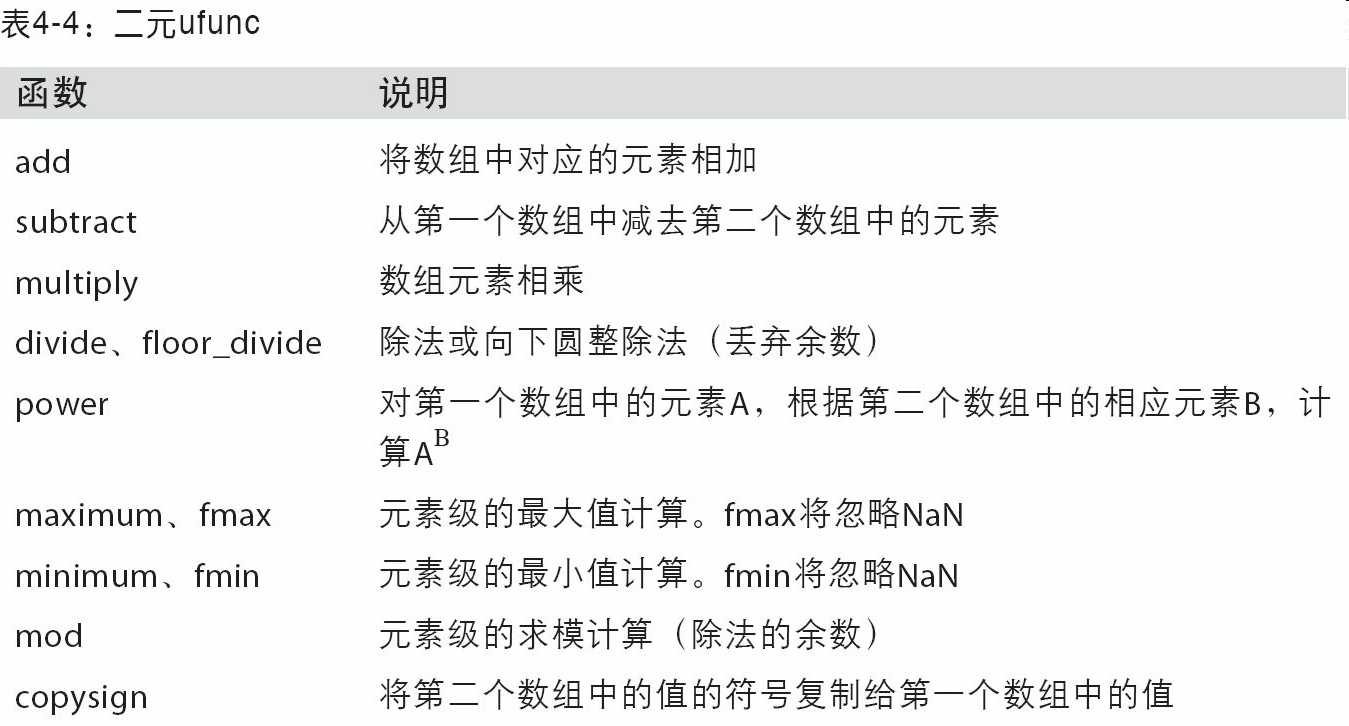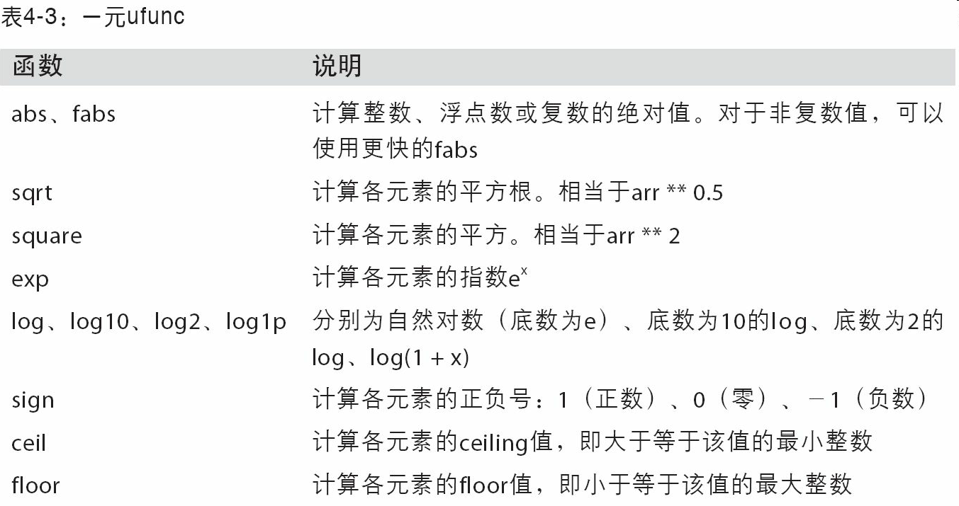 - 用于对整组数据进行快速运算的标准数学函数(无需编写循环)。